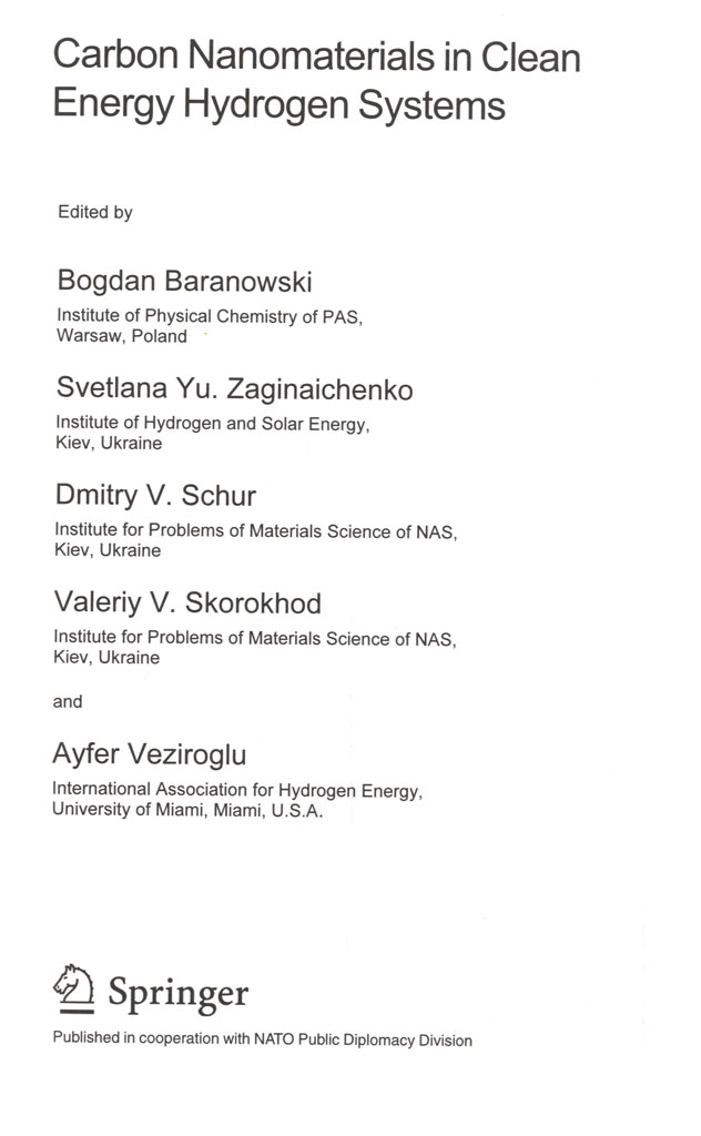 Carbon nanomaterials in clean energy hydrogen systems : proceedings of the NATO Advanced research workshop on using carbon nanomaterials in clean-energy hydrogen systems, Sudak, Crimea, Ukraine, 22-28 Sept. 2007 / ed. by Baranowski Bogdan [et al.]. -Dordrecht : Springer, cop. 2008. - XXXIII, 907 c. : ил., портр., табл. - (NATO science for peace and security series. Ser. C, Environmental security, ISSN 1874-6519). - Библиогр. в конце докл. Указ.: Auth. ind., Subject ind.: c. 899-907. Обложка 1 Оглавление1234567