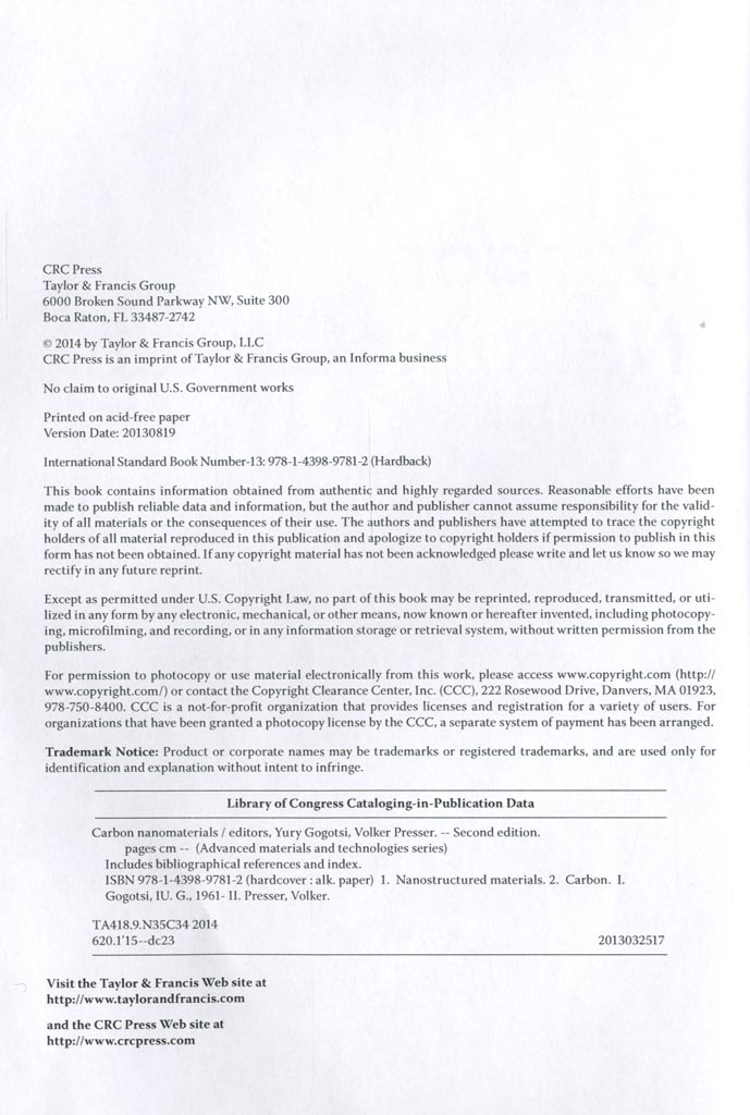 Carbon nanomaterials / ed. by Gogotsi Yury and Presser Volker. -2d ed. - Boca Raton (FL) [etc.] : CRC press, 2014. - XV, 513 c.: ил. - Advanced materials and technologies series. Обложка 1 Оглавление1234