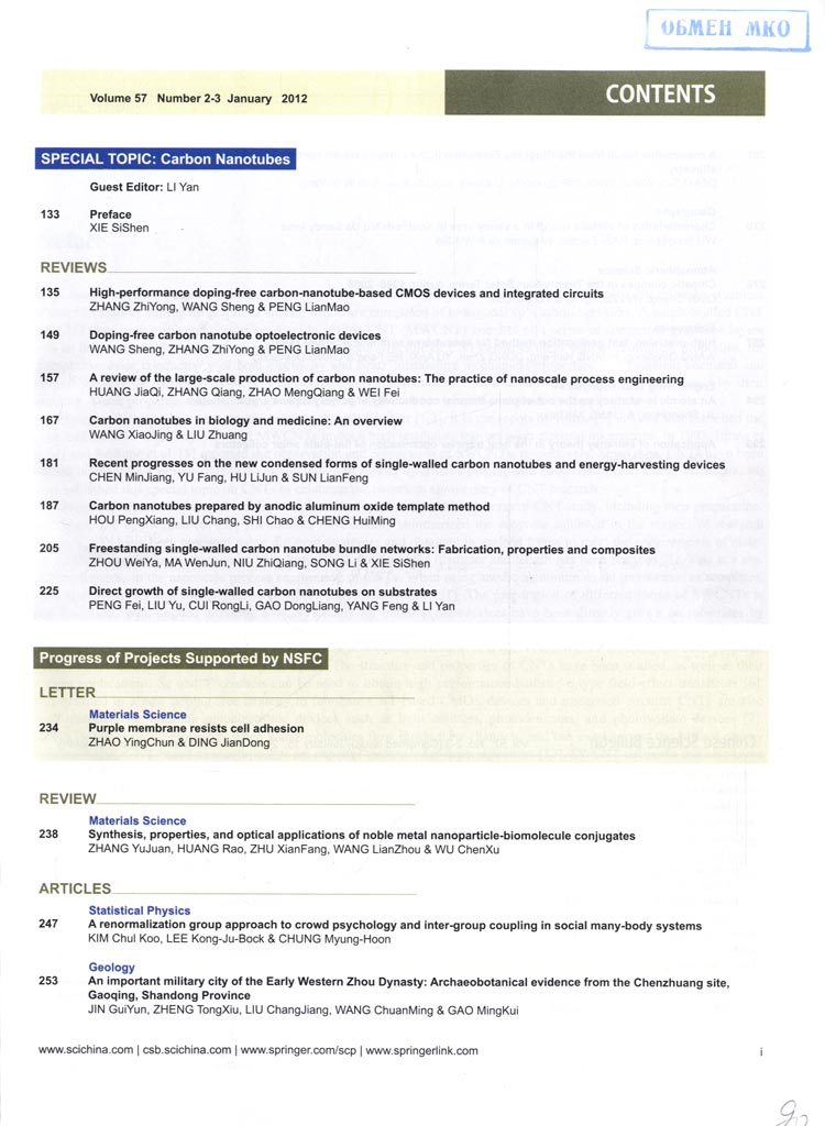 Carbon nanotubes. -Beijing : Science in China press; Heidelberg : Springer, 2012. - C. 133-306, [2] : ил., табл. - Chinese science bulletin, ISSN 1001-6538; vol. 57, nr 2-3, spec. topic. Обложка 1 Оглавление12
