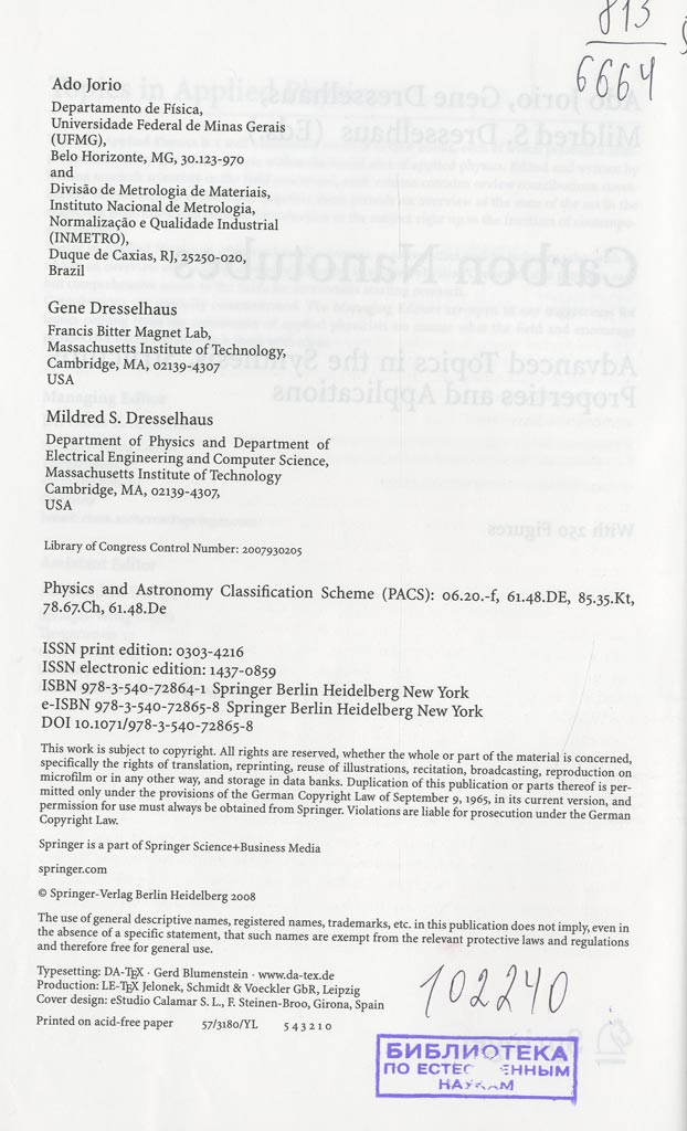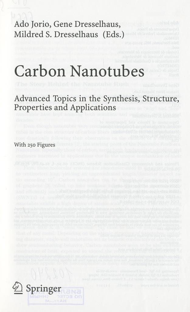 Carbon nanotubes : advanced topics in the synthesis, structure, properties and applications / Jorio Ado, Dresselhaus Gene, Dresselhaus Mildred S. (eds.). -Berlin [etc.] : Springer, cop. 2008. - XXIV, 720 c. : ил., табл. - Topics in applied physics, ISSN 0303-4216; vol. 111. Обложка 1 Оглавление123456789