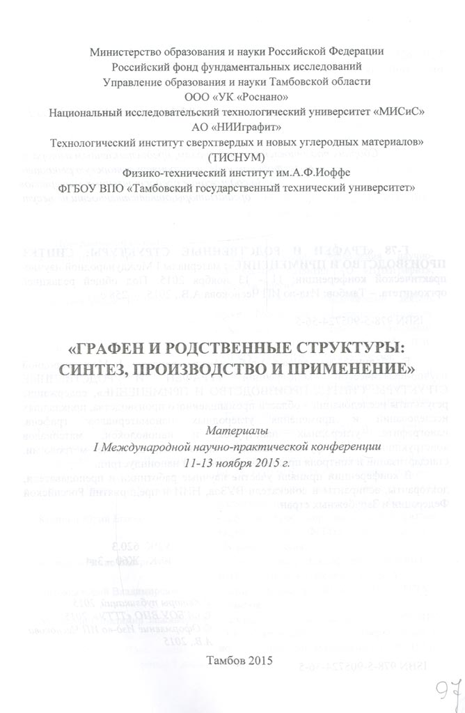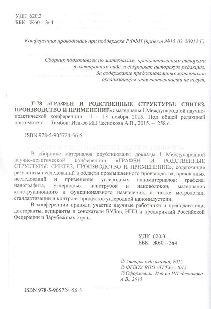 Графен и родственные структуры: синтез, производство и применение", международная научно-практическая конференция (1 ; 2015 ; Тамбов). "Графен и родственные структуры: синтез, производство и применение" : материалы I Международной научно-практической конференции, 11-13 ноября 2015 г. / Рос. фонд фундам. исслед., Нац. исслед. технол. ун-т "МИСиС", Физ.-техн. ин-т им. А.Ф. Иоффе. -Тамбов : Изд-во ИП Чеснокова А.В., 2015. - 254 с. : ил., табл. - Загл. обл.: Графен и родственные структуры: синтез, производство и применение. Рез. рус., англ. Обложка 1 Оглавление12345